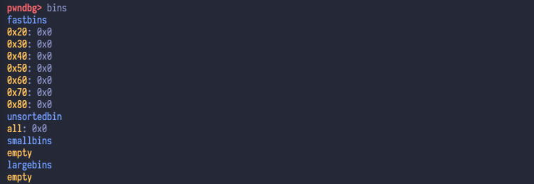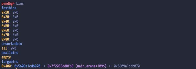 Wait, the freed chunk doesn’t go into the unsorted bin! That’s because the large chunk we’ve allocated is next to the top chunk, and when it is freed, it will be merged into the top chunk. To workaround this, simply allocate another small chunk with whatever size other than 0x28.