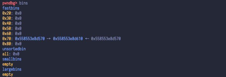Good. We now have two overlapping (same) chunks in the same fastbin. Now we can overwrite the fd field of this chunk.