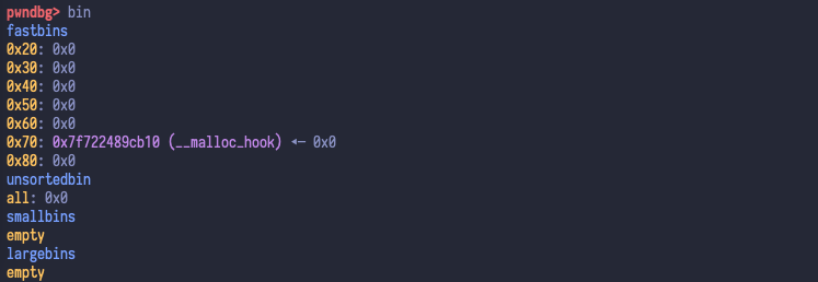 All the bytes near __free_hook are all NULL bytes, so it’s not easy to be overwritten with fastbin dup. However, there’s a sequence of bytes “7f 00 00 00 00 00 00 00” before __malloc_hook . If we use these bytes as the free chunk’s size field, then we’ll get a 0x70-byte free chunk, and this is enough for us to overwrite __malloc_hook .