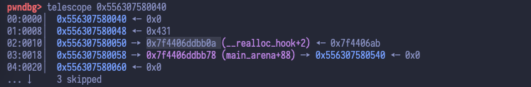 To workaround this, we need to place a 0x30-byte chunk in a fastbin, so that glibc can return that chunk instead of splitting from our 0x430-byte chunk. As shown below, the fd field of the 0x430-byte chunk is successfully leaked to stdout.