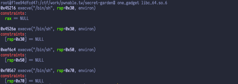 The last thing that will probably annoy you is that the constraints of all four one gadgets are unsatisfiable when __malloc_hook is triggered via option 1, “raise a flower”.